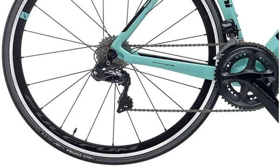 Under motorhuven sitter en kompetent drivlina som plockats in från Shimano (Ultegra Di2), det handlar kortfattat om 22 elektroniska växlar och smidiga reglage som i princip aldrig krånglar. Italiensk design på högsta nivå utesluter såklart mediokra dussingrejor, och hjärtat i skapelsen är ett effektivt vevparti med dubbla framdrev som kombineras med en 11-delad kassett vilket ger en utväxling med imponerande bredd men där fokus ligger på lite högre farter. Kassetten är dessutom tätt stegad, så att du utan problem kan hålla exakt rätt kadens.
